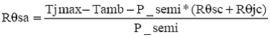 升压 FET 散热片尺寸的计算在输入电压最低时进行,因为此时 FET 功率损耗最高。以下方程可用于计算传统或跟随器型要求的散热片 (Rθsa) 的最小热阻。其中,Tjmax 为最高的结温,Tamb 为最高的环境温度,Rθjc 为半导体接面至外壳的热阻,而 Rθsc 则为散热片到外壳的热阻抗。