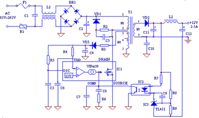 以VIPer50为核心的开关电源,具有外围电路简单、使用灵活、成本低廉、可靠性高等优点,因此在液晶显示器电源、打印机电源、VCR和DVD播放机电源等领域中具有广泛的应用前景。